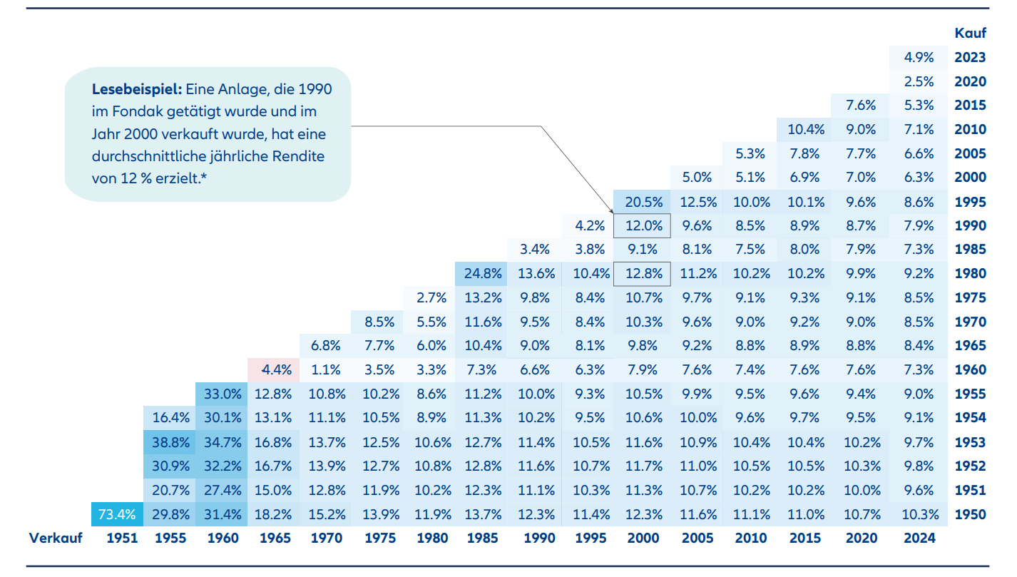 * Quelle: IDS GmbH; Allianz Global Investors; per 31. Dezember 2024, annualisiert (jährliche Aktualisierung). Das Renditedreieck zeigt die durchschnittlichen jährlichen Renditen für beliebige Anlagezeiträume, also Kombinationen von Kauf- und Verkaufszeitpunkten auf Jahresbasis. Die erzielte annualisierte Rendite kann am Schnittpunkt dieser beiden Koordinaten abgelesen werden. Die frühere Wertentwicklung lässt nicht auf zukünftige Renditen schließen. Der Betrag wird wie folgt berechnet: Kein Ertragsanteil orientiert am Ausgabeaufschlag. Alle Ausschüttungen werden am Tag der jeweiligen Ausschüttung reinvestiert. Die Performance basiert auf der Back-Office-Bewertung, abzüglich der Gebühren.