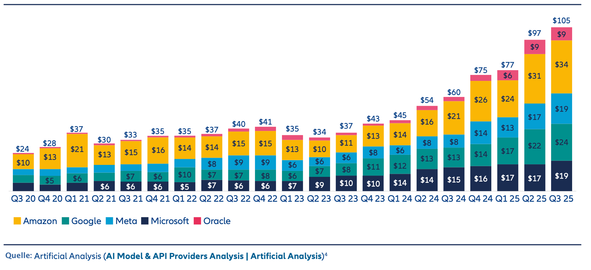 Die Investitionsausgaben der weltweit größten Technologieunternehmen zeigen, dass sie fest davon überzeugt sind, dass die Führungsrolle im Bereich Künstliche Intelligenz (KI) der Preis des Jahrhunderts ist – eine einmalige Gelegenheit, die die nächste Generation unternehmerischer Dominanz definieren wird. Microsoft, Alphabet, Meta, Amazon und ihre Wettbewerber betrachten KI nicht als Nebenprojekt, sondern als Fundament ihrer zukünftigen Geschäftsmodelle. Für sie bedeutet ein Scheitern in der Führungsrolle das Risiko der Bedeutungslosigkeit. Obwohl die Überzeugung absolut ist, bleibt unklar, wie diese Führungsrolle konkret aussieht, wann sie sich materialisiert und wie sie sich genau in finanzielle Erträge umsetzen lässt. Wir wissen, dass das Rennen existenziell ist, aber das Ziel ist noch nicht klar definiert.