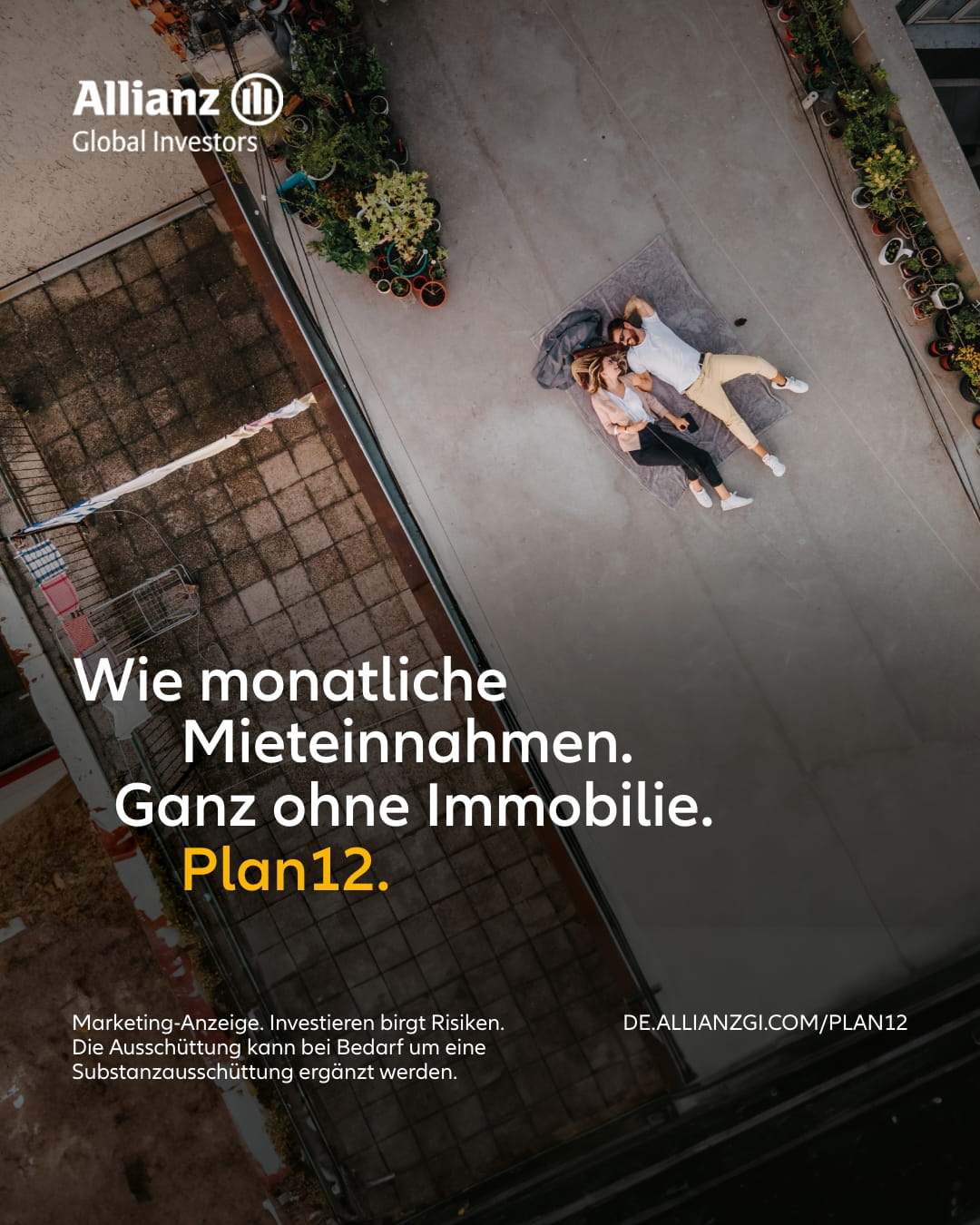 Plan12 steht für aktiv gemanagte Fonds von Allianz Global Investors, die auf Wachstum ausgerichtet sind und monatliche Ausschüttungen aus Zinsen und Dividenden anstreben. Wir nennen das Kapitaleinkommen. Und davon kann man monatlich profitieren. Ob als Beitrag zur Schließung der Rentenlücke, zur Ausbildungsunterstützung der Enkel, für den Kurzurlaub zwischendurch oder einfach für all die Dinge, die man sich gerne gönnt.