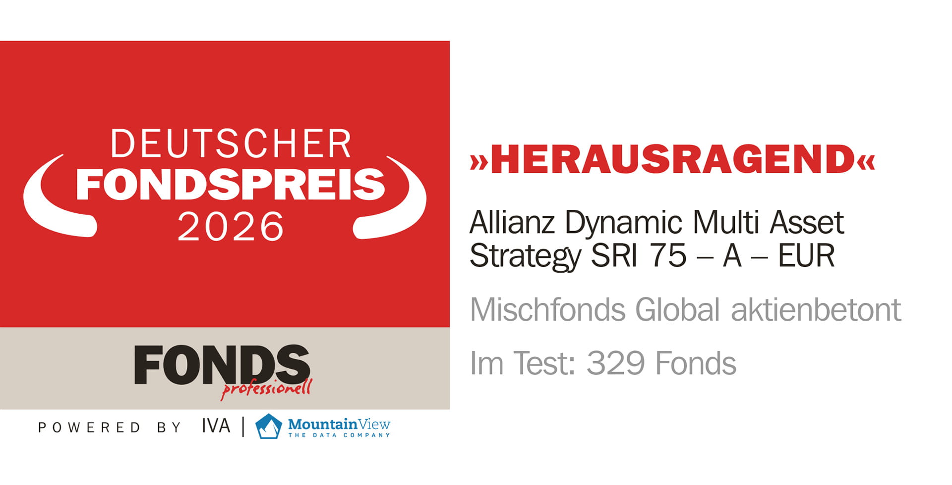 Die glücklichen Sieger des diesjährigen DEUTSCHEN FONDSPREISES sind gekürt. Im Rahmen des FONDS professionell KONGRESS in Mannheim wurde wieder die begehrte Auszeichnung verliehen. Wir freuen uns, dass wir in der Kategorie Mischfonds Global aktienbetont mit "herausragend" beurteilt wurden.