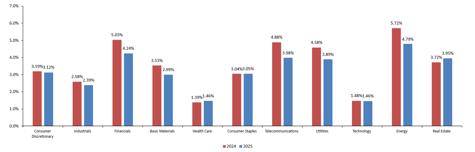 Dividendenrendite pro Sektor in den Jahren 2024 und 2025