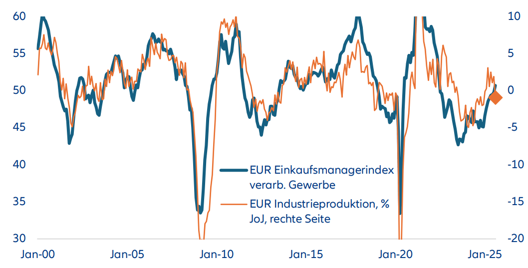 Regelmäßig veröffentlichte offizielle Wirtschaftsdaten haben unter anderem den klaren Nutzen, dass man die eher stimmungsabhängigen Ergebnisse von Unternehmensumfragen anhand dieser Zahlen überprüfen kann. In den USA ist dies aufgrund der zeitweiligen Behördenschließungen („Shutdown“) derzeit nicht oder allenfalls verspätet möglich. Im Euroraum klappt es hingegen noch sehr gut. Insbesondere die Auftragseingänge in der Industrie und die Industrieproduktion deuten darauf hin, dass die Erholung zumindest an Schwung verliert oder womöglich sogar zum Stillstand kommt, da die Nachfrage teils vorgezogen wurde, um die höheren Zölle zu umgehen – und dementsprechend jetzt fehlt. Insofern erscheint der Anstieg des Einkaufsmanagerindex für das verarbeitende Gewerbe im Euroraum inzwischen ein bisschen übertrieben (vgl. dazu unsere Grafik der Woche). In der kommenden Woche wird sich die Aufmerksamkeit sicherlich stark auf diese Daten richten.
