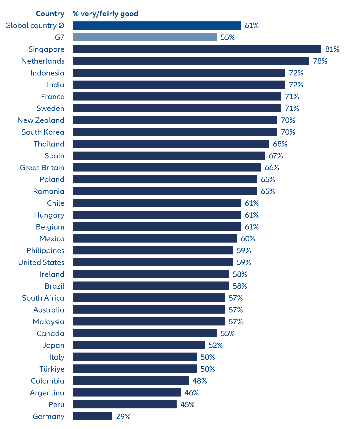 Laut einer Studie der Global Infrastructure Investor Association (GIIA) bewerten nur 55 % der Befragten in den G7-Staaten die Qualität der digitalen Infrastruktur ihres Landes im Hinblick auf 5G und Glasfaser-Internet als sehr gut oder zumindest recht gut (siehe Grafik 1).