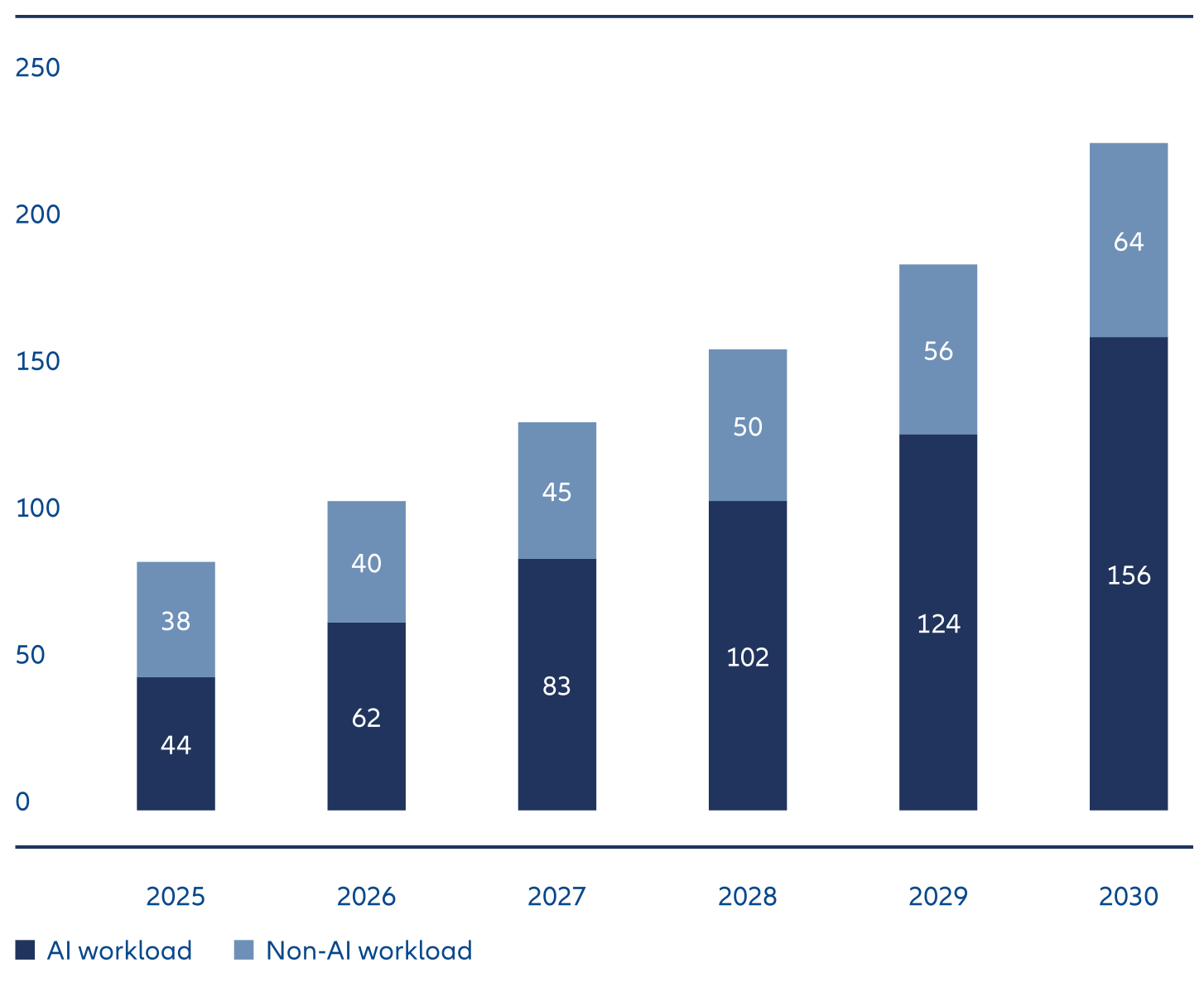 Quelle: Allianz Research, „3,5 % to 2035: Bridging the Global Infrastructure Gap”; McKinsey and Company, McKinsey Data Center Demand Model, Gartner-Berichte, IDC-Berichte, Nvidia-Kapitalmarktberichte, Allianz Research.