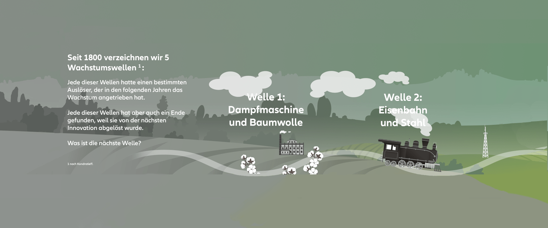 Die Welt ist aktuell geprägt von anhaltendem Bevölkerungswachstum, Digitalisierung, der Jagd nach Rendite und nicht zuletzt von der zunehmenden Knappheit des Faktors „Umwelt“, Stichwort Klimawandel und Zerstörung der Ökosysteme. Die zunehmende Umgestaltung der Ökonomien auf nachhaltiges Wachstum treibt diese Entwicklungen weiter voran. Dieses Wachstum wird jedoch anders sein als das bisherige – und es wird "smart" sein – von der Logistik bis hin zur Landwirtschaft. Digitalisierung und Künstliche Intelligenz werden ein Teil unseres Alltags. Wir haben die vergangenen Wachstumszyklen analysiert, ihre Ursachen und Verstärker identifiziert und kommen zu dem Schluss: Die nächste lange Wachstumsphase wird grün sein – und sie hat bereits begonnen.2
