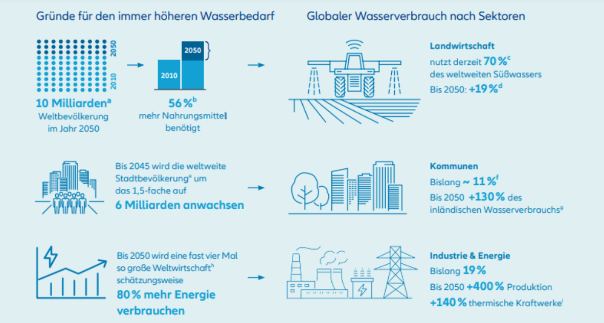 Gefragt sind ganzheitliche Lösungen für eine nachhaltige Erhaltung, Bewirtschaftung und Wiederauffüllung der natürlichen Süßwasserspeicher. Dadurch entwickelt sich ein Markt, dessen Segmente in den nächsten Jahren zum Teil ein nahezu zweistelliges Wachstum verzeichnen werden.