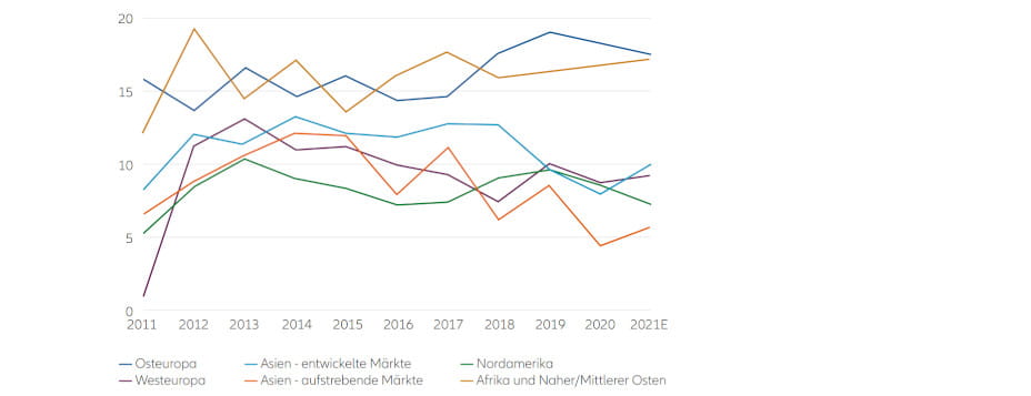 Die Rentabilität ist in mehreren Regionen gesunken Eigenkapitalrendite der Versicherer nach Regionen in %